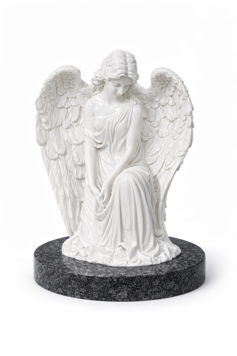Скорбящий сидящий ангел. Модель СМ-11 передает атмосферу глубокой, безмолвной печали и вечного покоя. Ангел изображен сидящим, его голова в тихой скорби опущена на скрещенные руки. Мягкие, ниспадающие линии крыльев и струящиеся складки одеяний создают очень трогательный, лиричный образ. Белоснежный литьевой мрамор придает фигуре хрупкость и чистоту, делая эту скульптуру выразительным символом неугасающей любви и горечи утраты.