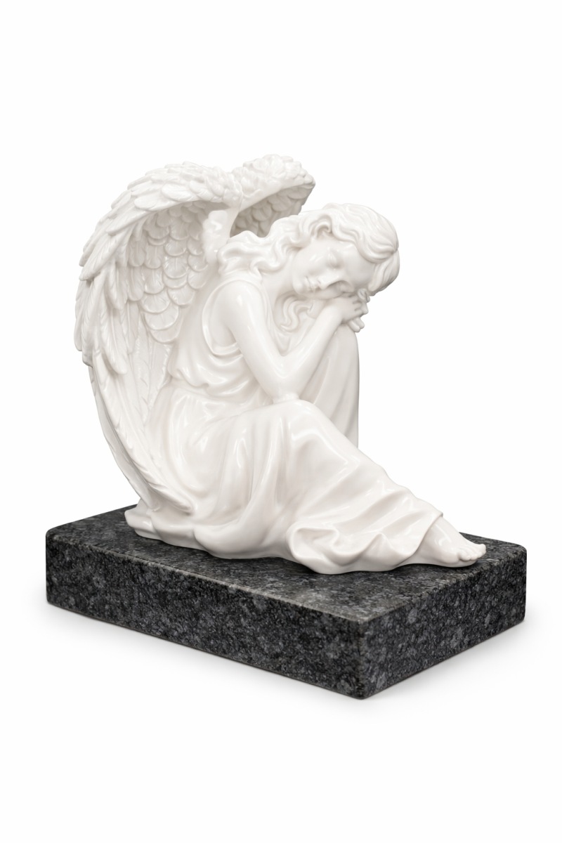 Ангел, обнимающий крест. Скульптура СМ-12 — это глубоко духовная композиция, символизирующая непоколебимую веру и надежду на спасение. Фигура ангела бережно и трепетно обнимает большой крест, склонив к нему голову. Идеальная гладкость белого мрамора выгодно подчеркивает тонкие черты лица и фактуру ангельских крыльев. Эта статуя станет сильным смысловым центром христианского мемориала, выражая упование на милосердие и вечную жизнь.