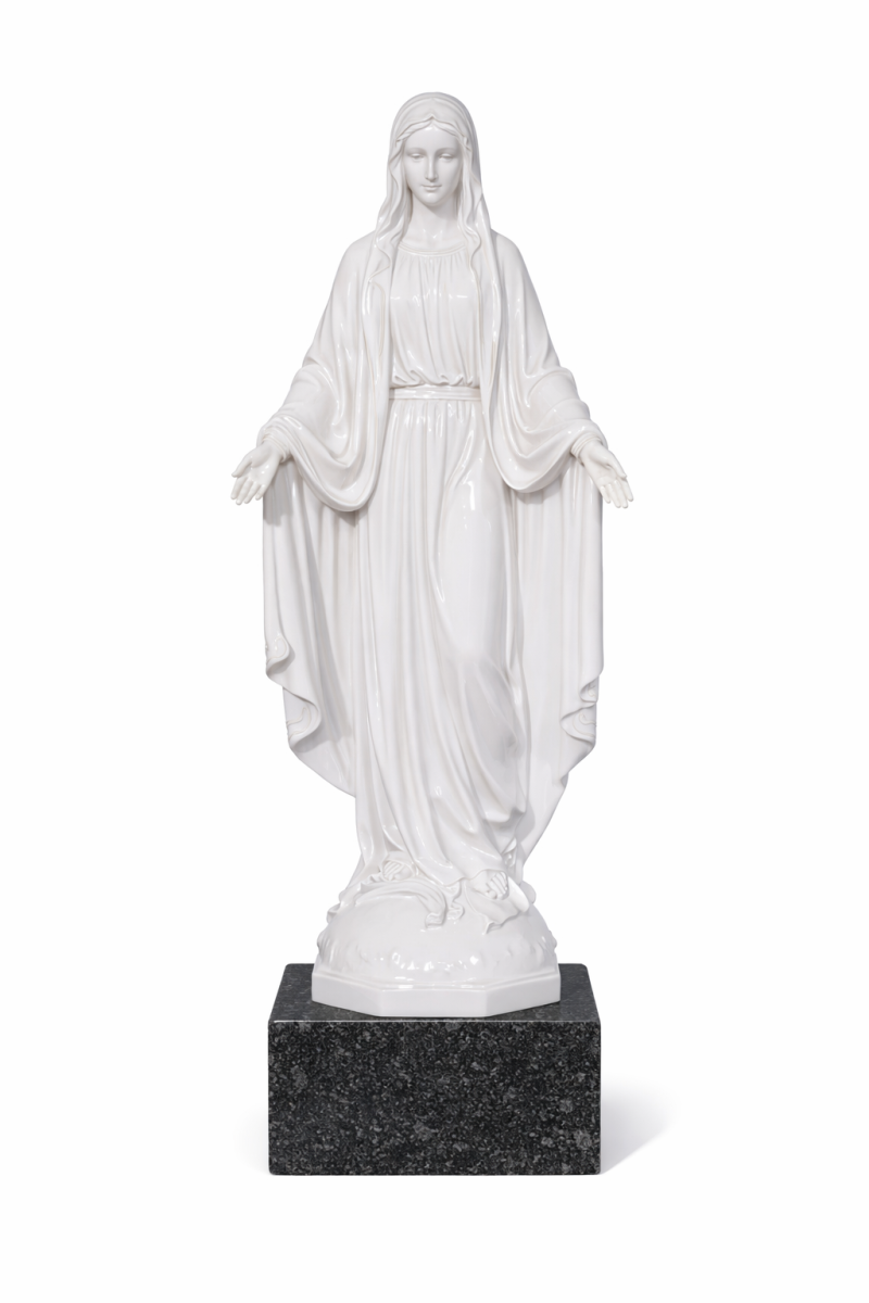 Светлый образ Богоматери (с открытыми руками). Скульптура СМ-2 воплощает классический канонический образ Девы Марии. Фигура запечатлена в легком движении навстречу, ее руки мягко опущены и раскрыты в жесте абсолютного принятия, милосердия и всепрощения. Тщательно проработанные ниспадающие складки одеяния и сострадательное выражение лица передают атмосферу глубокого покоя. Этот монументальный символ материнской защиты станет сильным духовным центром захоронения.