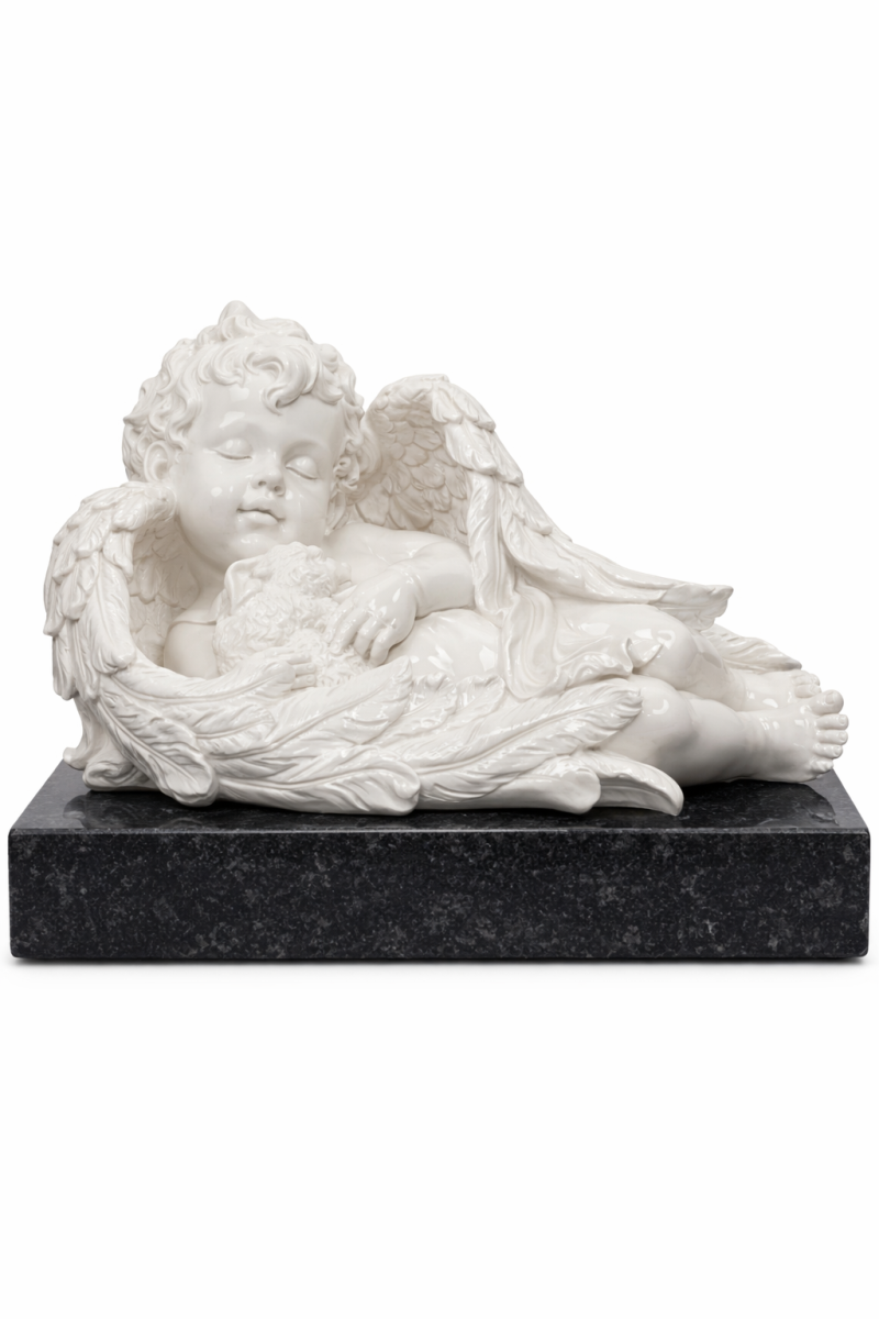 Спящий ангел-младенец (херувим). Модель СМ-5 — это пронзительный и невероятно нежный образ, созданный для самых трогательных мемориалов. Маленький ангел безмятежно спит, свернувшись на мягком ложе из собственных пушистых крыльев. Идеально гладкая фактура белого камня придает лицу херувима мягкость и теплоту. Эта скульптура традиционно используется для оформления детских захоронений, олицетворяя абсолютную невинность и вечный, спокойный сон.
