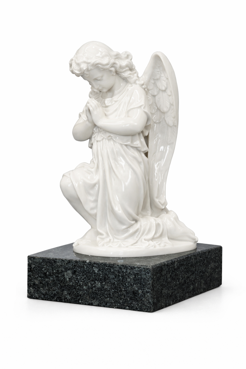 Юный ангел глубокой скорби. Скульптура СМ-8 передает чистую, искреннюю эмоцию светлой печали. Юный ангел изображен опустившимся на колени, его ладони бережно сложены в молитвенном жесте. Взгляд опущен вниз, выражая абсолютное смирение перед вечностью. Высочайшая детализация фактуры — от мягких локонов до складок туники — в сочетании с ослепительно белым цветом камня делает эту скульптуру живой и трогательной.