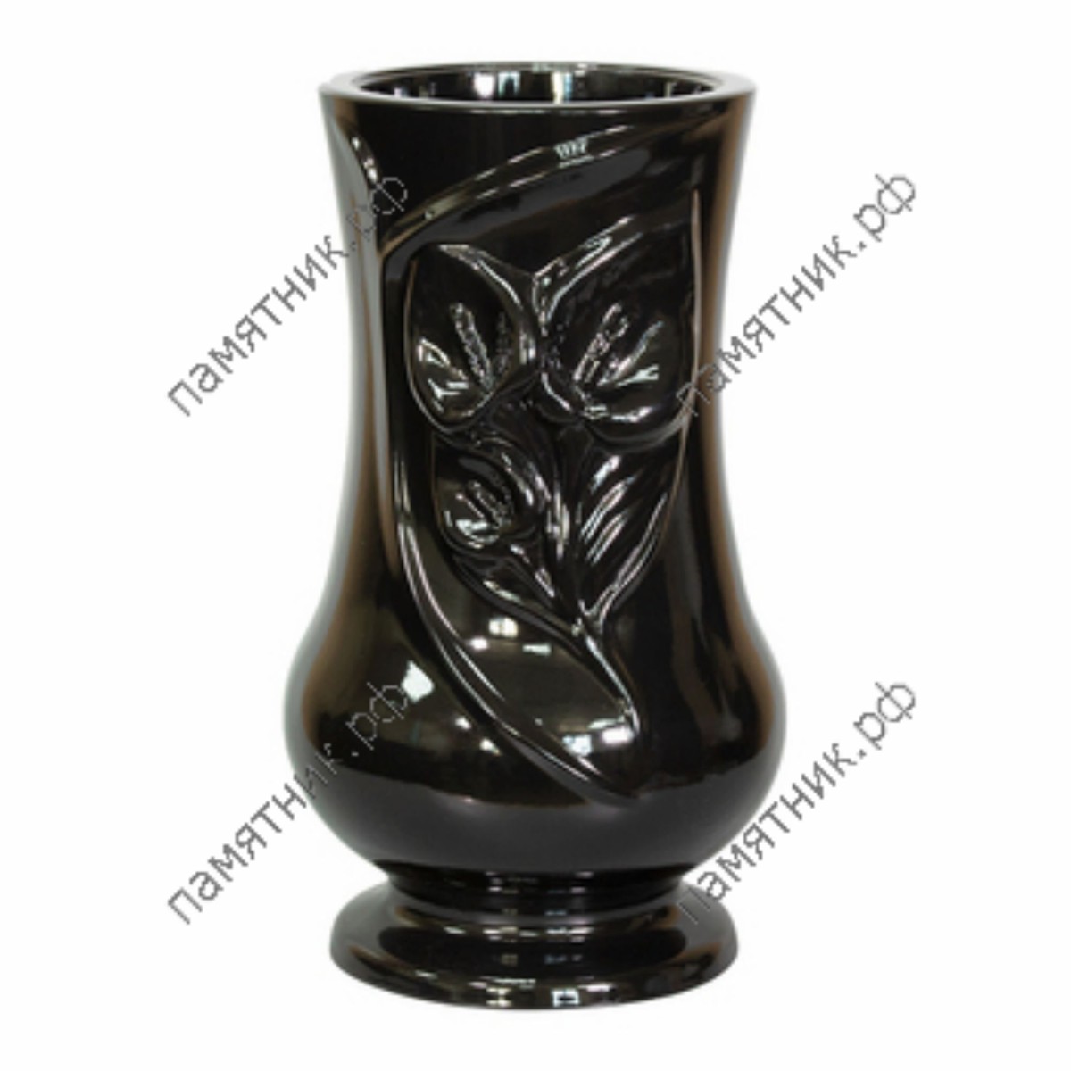 Изящная форма с рельефом калл. Модель ВП-17 имеет утонченный, слегка вогнутый профиль и украшена великолепным флористическим барельефом. На лицевой стороне искусно вылеплены цветы каллы — традиционный мемориальный символ чистоты, умиротворения и светлой скорби. Идеальная глянцевая фактура черного полимербетона выгодно подчеркивает каждую деталь лепестков.