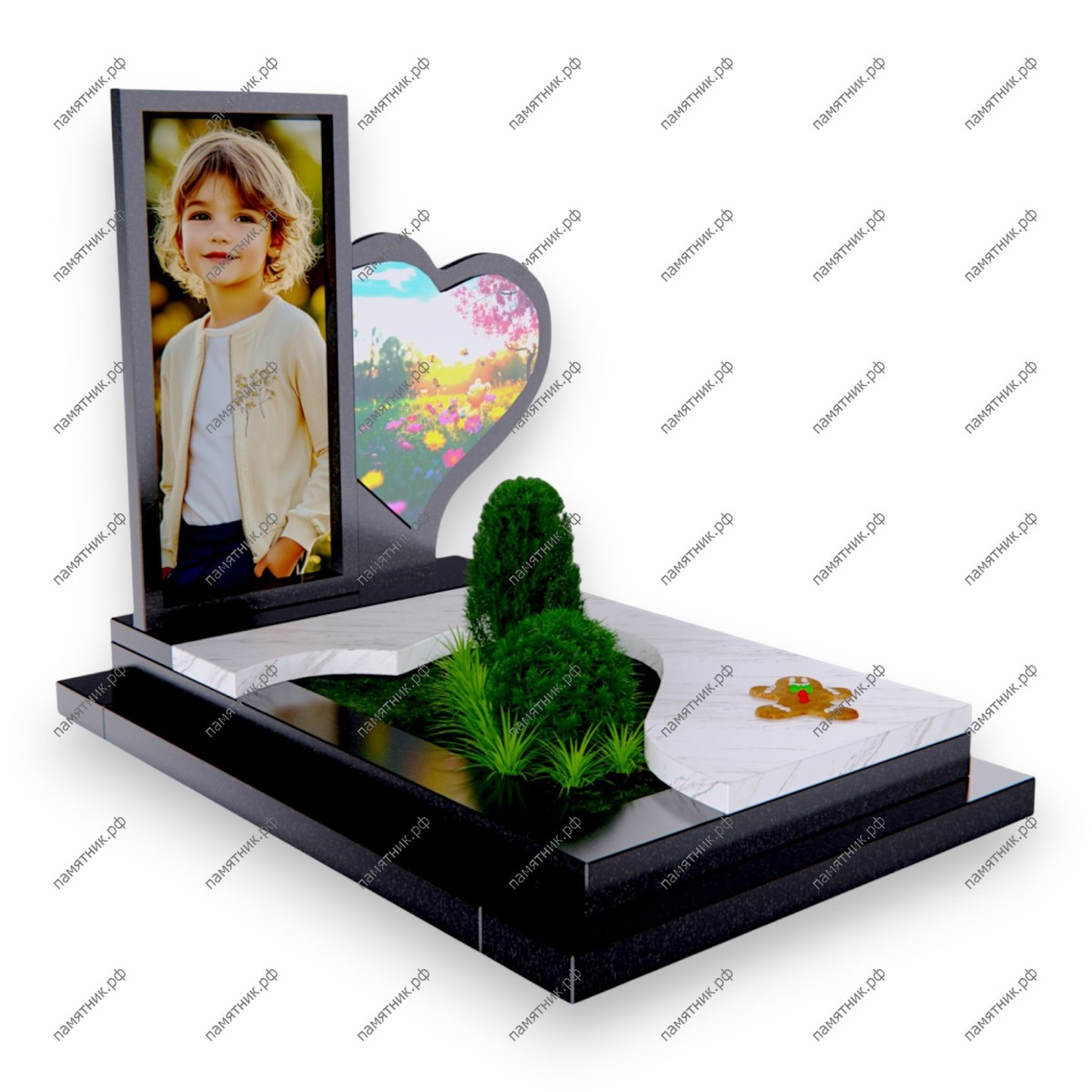 Особенности: Внутри сердца размещена красочная фотокерамика с изображением летнего цветущего луга и бабочек — символ вечного лета и рая. Надгробная плита представляет собой красивую волну из белого мрамора, нависающую над глянцевым черным основанием. Под волной организован зеленый цветник. Дополняет композицию милая деталь в виде пряничного человечка на белом камне.