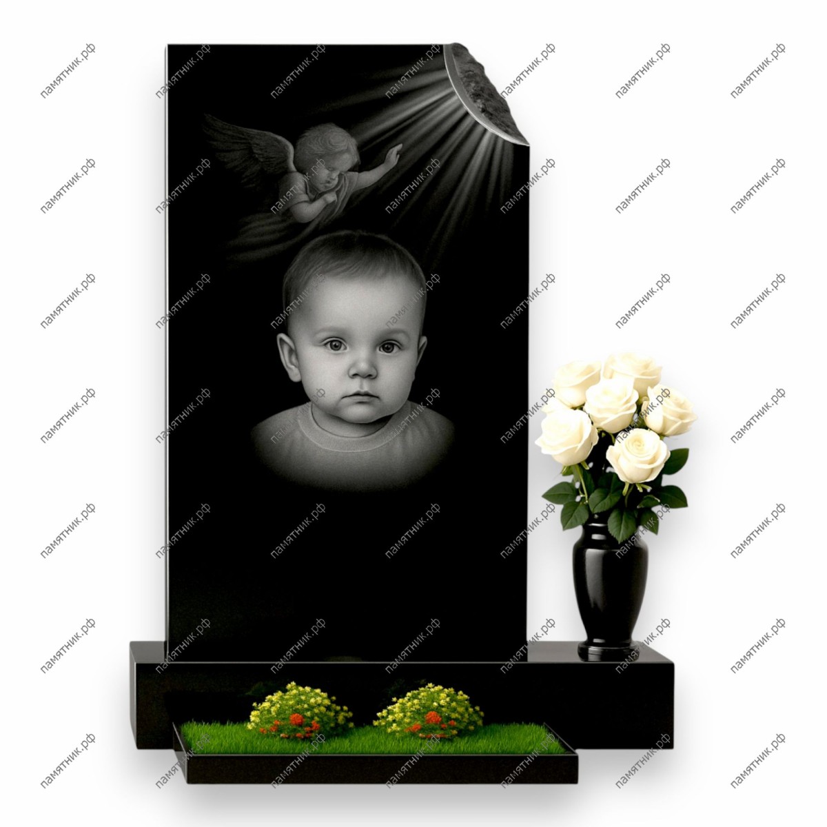 Описание: Строгая вертикальная стела. Правый верхний угол художественно сколот, обнажая рельефную фактуру камня, из-под которой выгравированы пробивающиеся лучи света. Центральную часть занимает высокохудожественная гравировка: ангел, спускающийся к крупному портрету малыша.