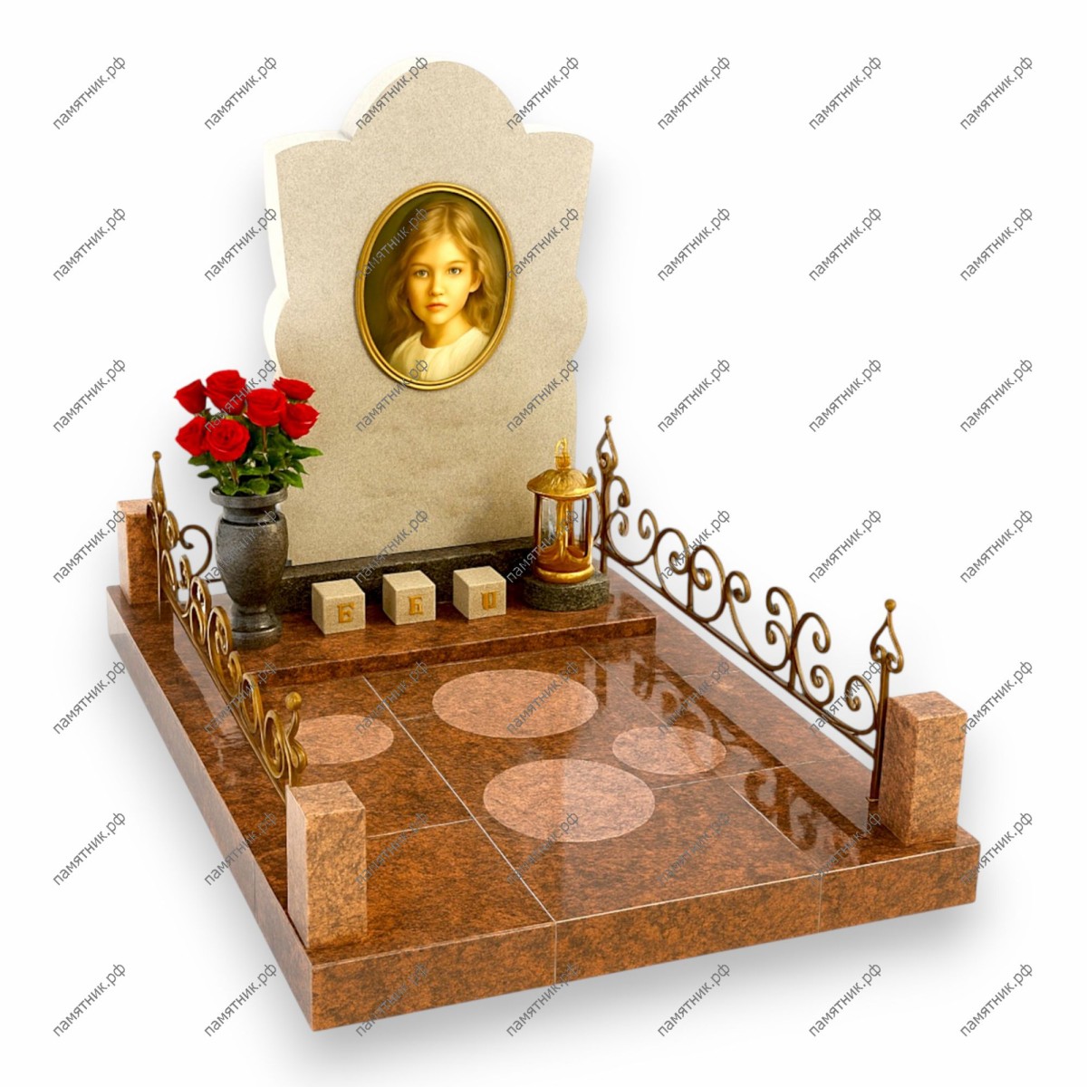 Особенности: Массивное и богатое основание выполнено из красно-коричневого гранита в виде сплошной надгробной плиты, украшенной круглыми декоративными вставками. Участок огражден красивой кованой металлической оградой бронзового цвета с небольшими гранитными столбиками. Перед стелой лежат три светлых каменных кубика с золотыми буквами, слева стоит темная ваза с пышными красными розами, а справа — декоративная бронзовая лампада.