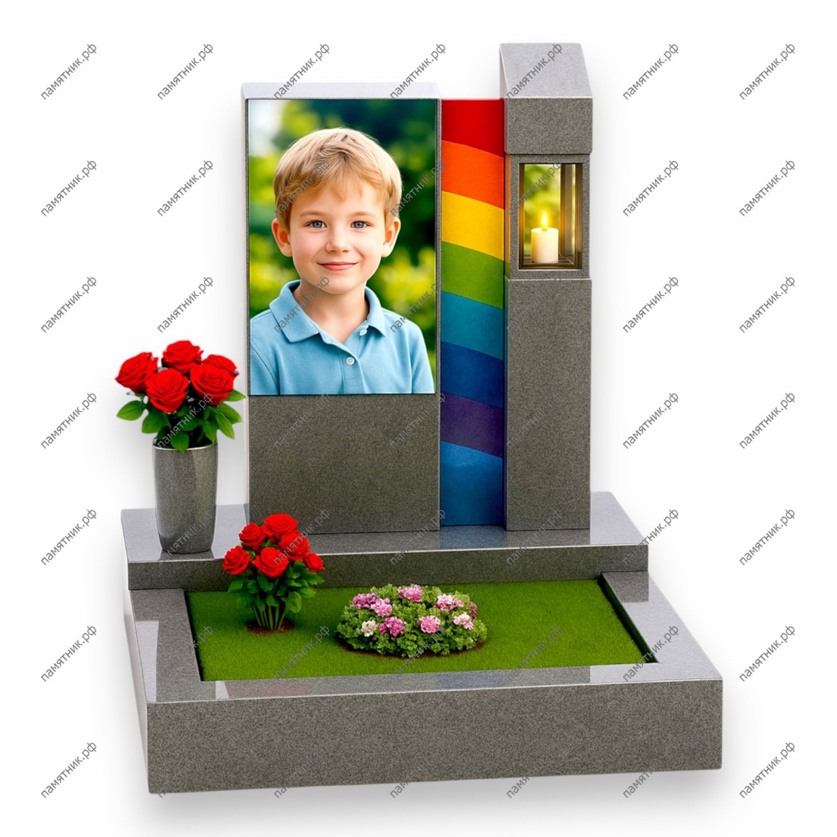 Описание: Необычная двусоставная стела. Левая, более широкая часть содержит крупный цветной портрет мальчика. Правая часть представляет собой узкую колонну со встроенной застекленной лампадой со свечой. Между блоками расположена яркая вертикальная вставка в виде радуги.