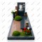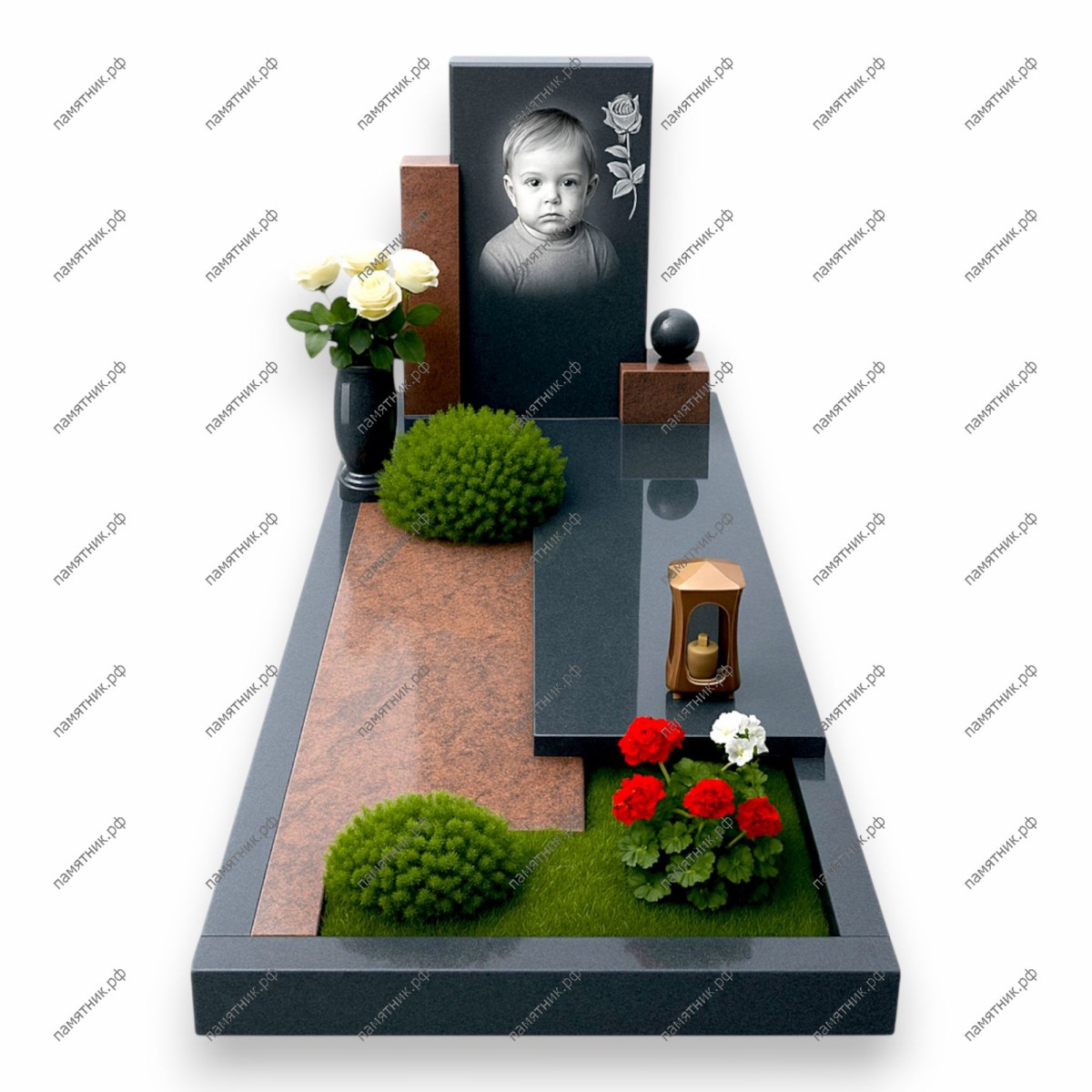 Особенности: Основание имеет сложный асимметричный дизайн с перекрывающимися плитами разных цветов. На участке интегрированы зоны с зеленым газоном: высажены два круглых декоративных кустика и оборудована клумба с яркими красными и белыми цветами. Дополняют композицию темная ваза с белыми розами и бронзовая лампада.