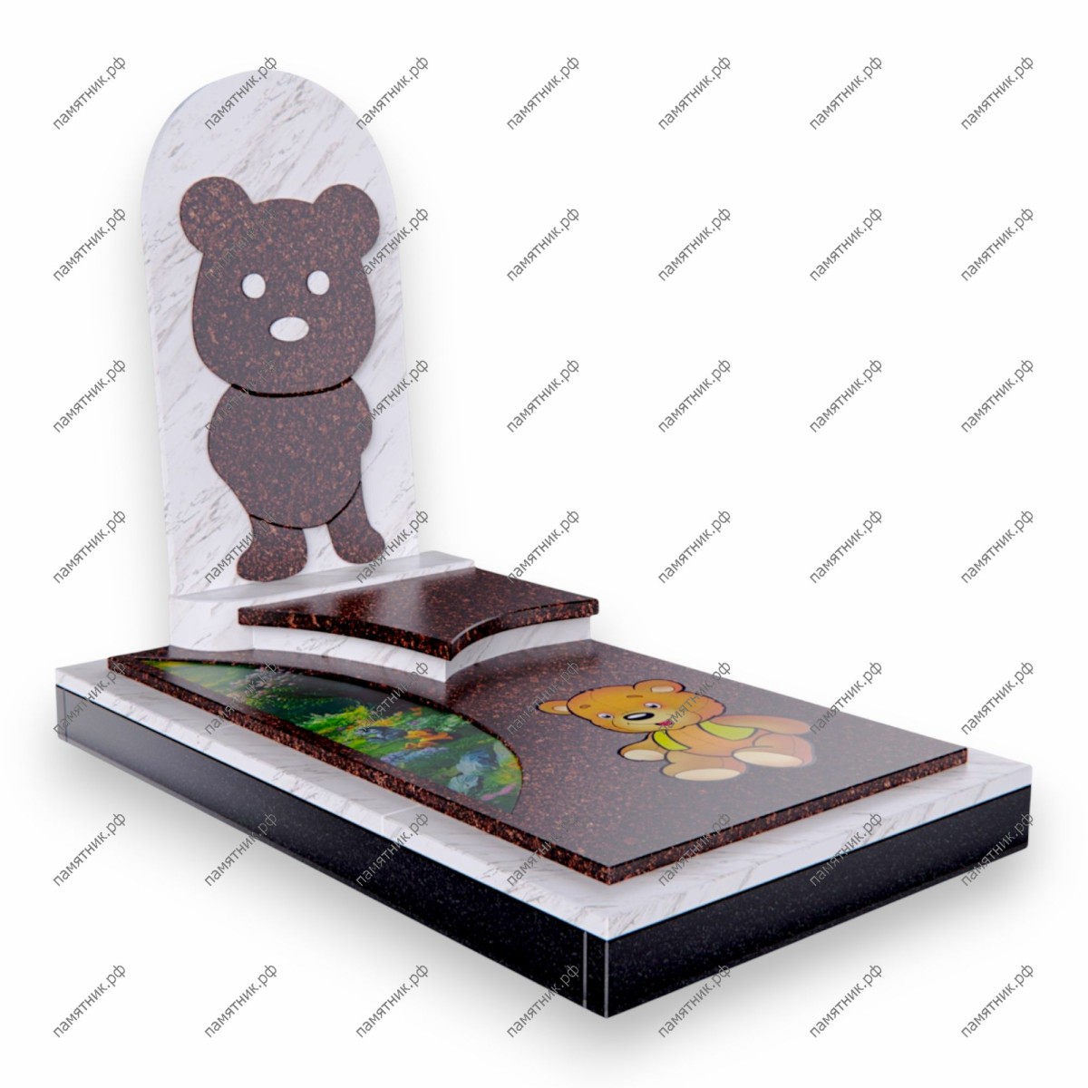 Особенности: Надгробная плита также выполнена из коричневого камня и имеет изящный дугообразный вырез. На поверхности плиты нанесено красочное цветное изображение медвежонка на фоне сказочного лесного пейзажа, что делает памятник очень личным и детским.