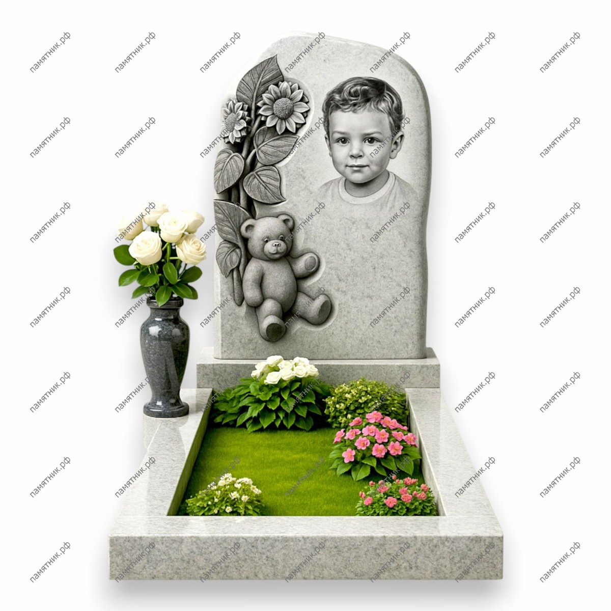 Описание: Фигурная стела с мягкими обводами. В правой части расположен черно-белый портрет ребенка, а левую сторону украшает богатая рельефная резьба: высокие подсолнухи и сидящий под ними объемный плюшевый медвежонок.