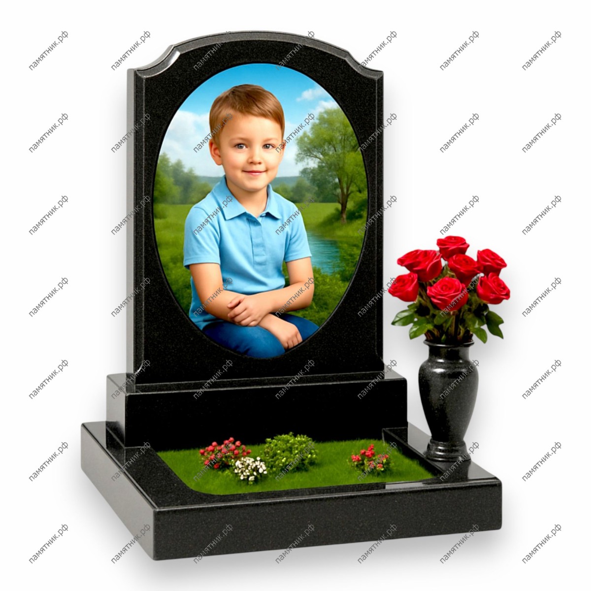 Описание: Лаконичная прямоугольная стела с изящным фигурным верхом. Практически всю поверхность занимает крупный вертикальный овальный портрет мальчика на фоне летнего пейзажа.