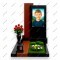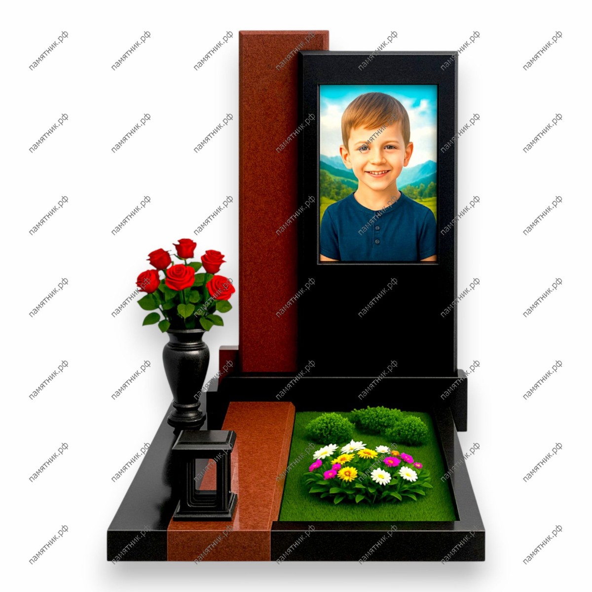 Описание: Современный памятник в строгом геометрическом стиле. Стела состоит из высокого черного прямоугольного блока с цветным портретом мальчика в рамке и примыкающей к нему слева высокой колонны из красного гранита.