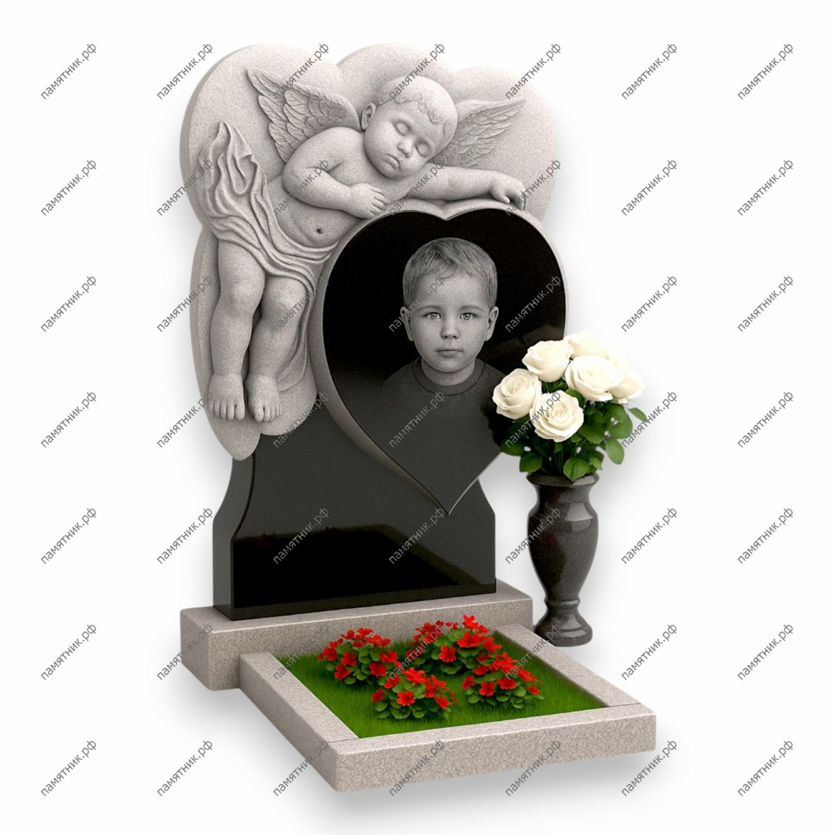 Описание: Очень трогательная скульптурная композиция. Центральное черное гранитное сердце с черно-белым портретом мальчика словно оберегает большая фигура спящего ангела, вырезанная из светлого камня.