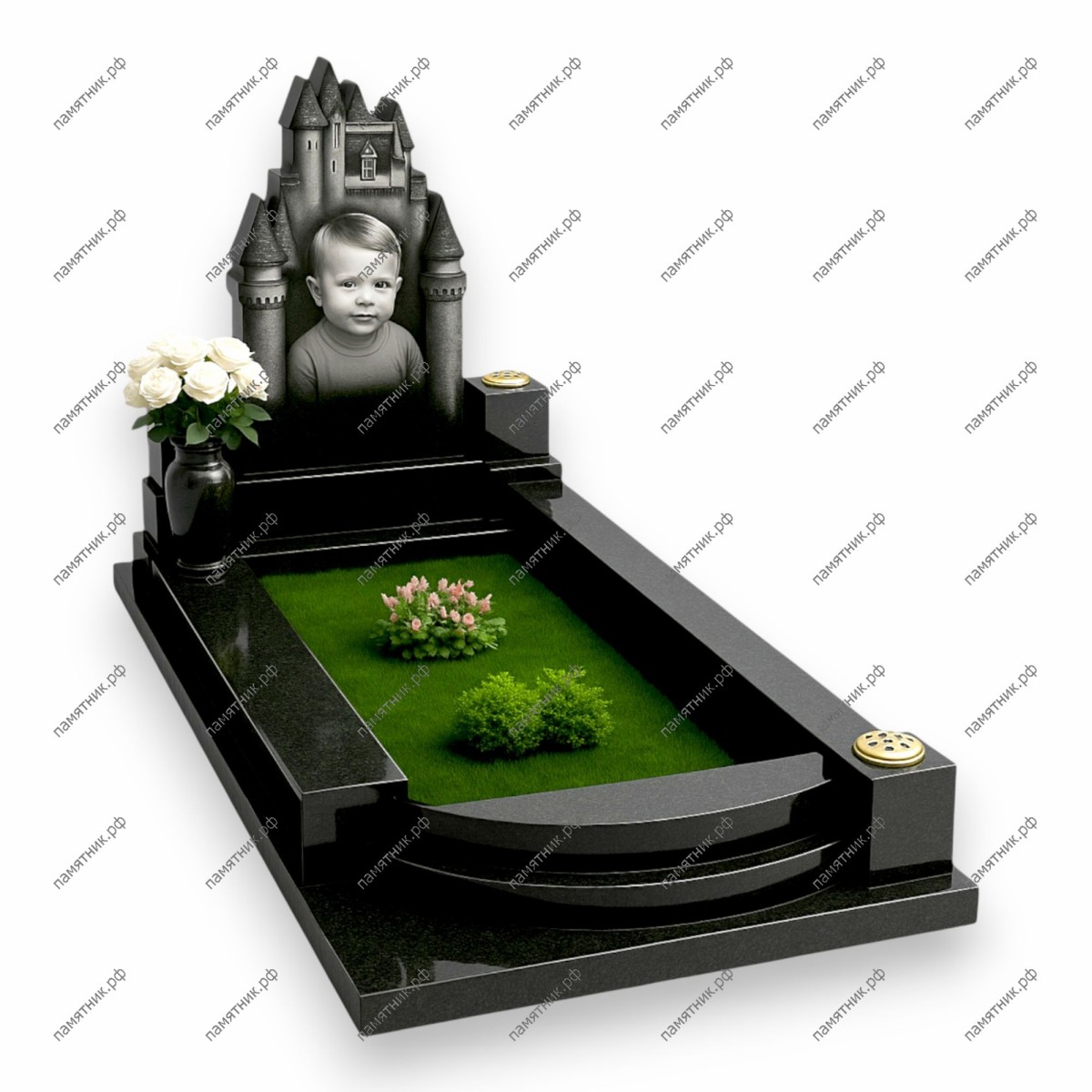 Описание: Уникальный памятник, выполненный в форме сказочного замка с множеством башенок и шпилей. В центральную часть замка интегрирован черно-белый портрет улыбающегося малыша.