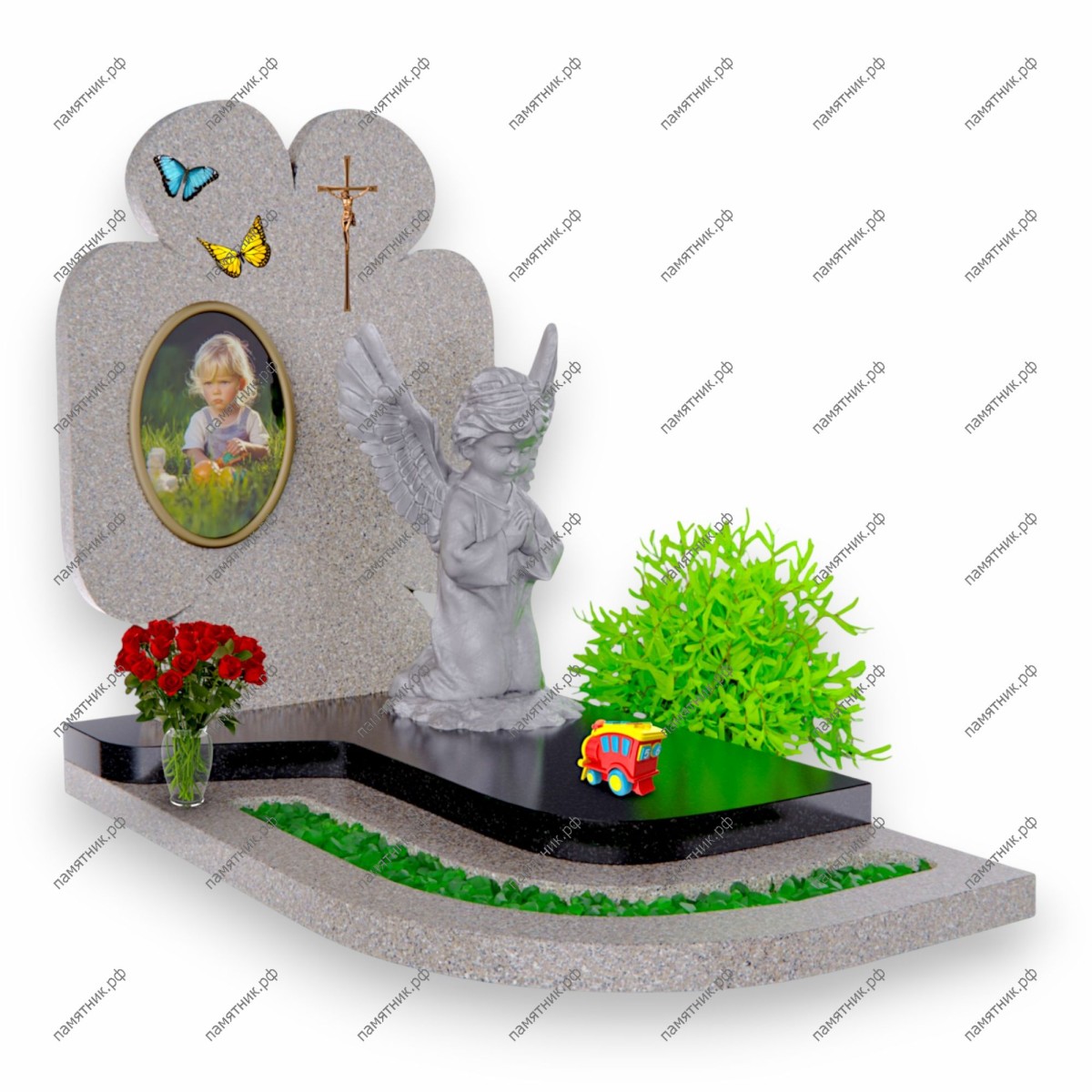 Особенности: Возле стелы установлена светло-серая скульптура маленького коленопреклоненного молящегося ангела. Фигурная черная надгробная плита образует Г-образный контур, оставляя место для цветника, который декорирован зеленой крошкой и высаженными кустарниками. На плите оставлена детская игрушка — яркий паровозик.