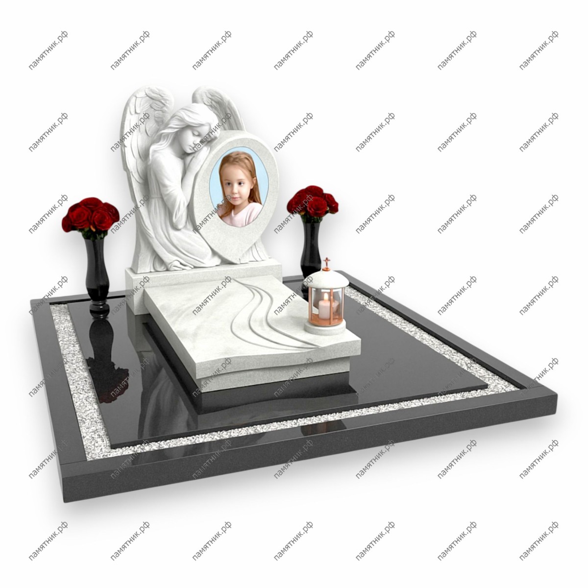 Описание: Величественный мемориал, где центральную роль играет фигура большого ангела с крыльями. Он бережно обнимает каплевидную рамку с цветным портретом девочки.