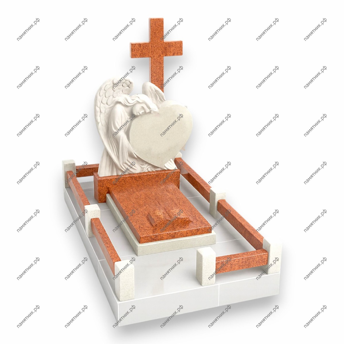 Описание: Яркая и теплая композиция. Большая скульптура ангела склонилась над сердцем из светлого камня (предназначено для портрета или надписи). Позади возвышается монументальный гранитный крест.