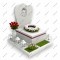 Особенности: Массивное надгробие-саркофаг украшено декоративной розовой полосой по периметру и пышным венком из розовых роз. По углам основания установлены четыре изящных белых фонаря-лампады. Композиция дополнена живыми растениями и вазой с красными розами.