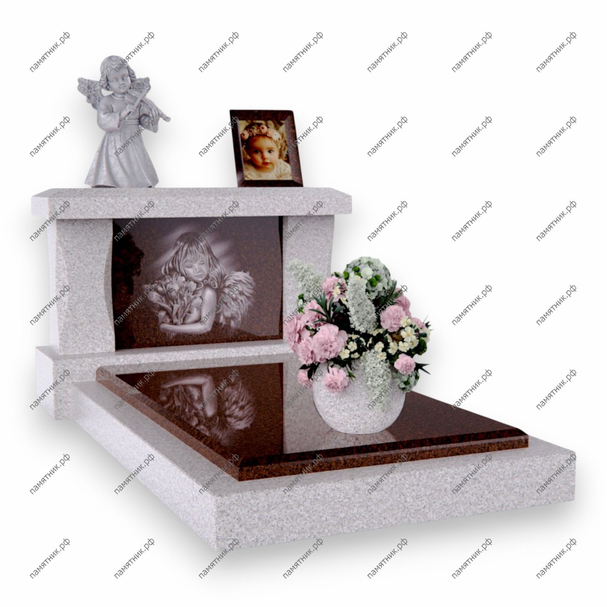 Описание: Горизонтальный мемориальный комплекс. Основная стела украшена художественной гравировкой плачущего ангела с букетом цветов. Сверху на полочке установлена фигурка ангела со скрипкой и небольшая рамка для фотографии.