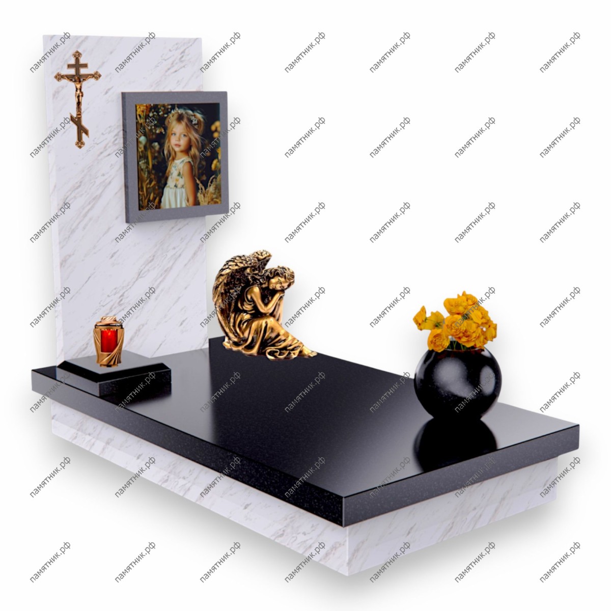 Описание: Строгая, но очень утонченная вертикальная стела прямоугольной формы из светлого камня. Украшена накладным бронзовым крестом и квадратным полноцветным портретом. Светлый цвет олицетворяет чистоту и невинность.