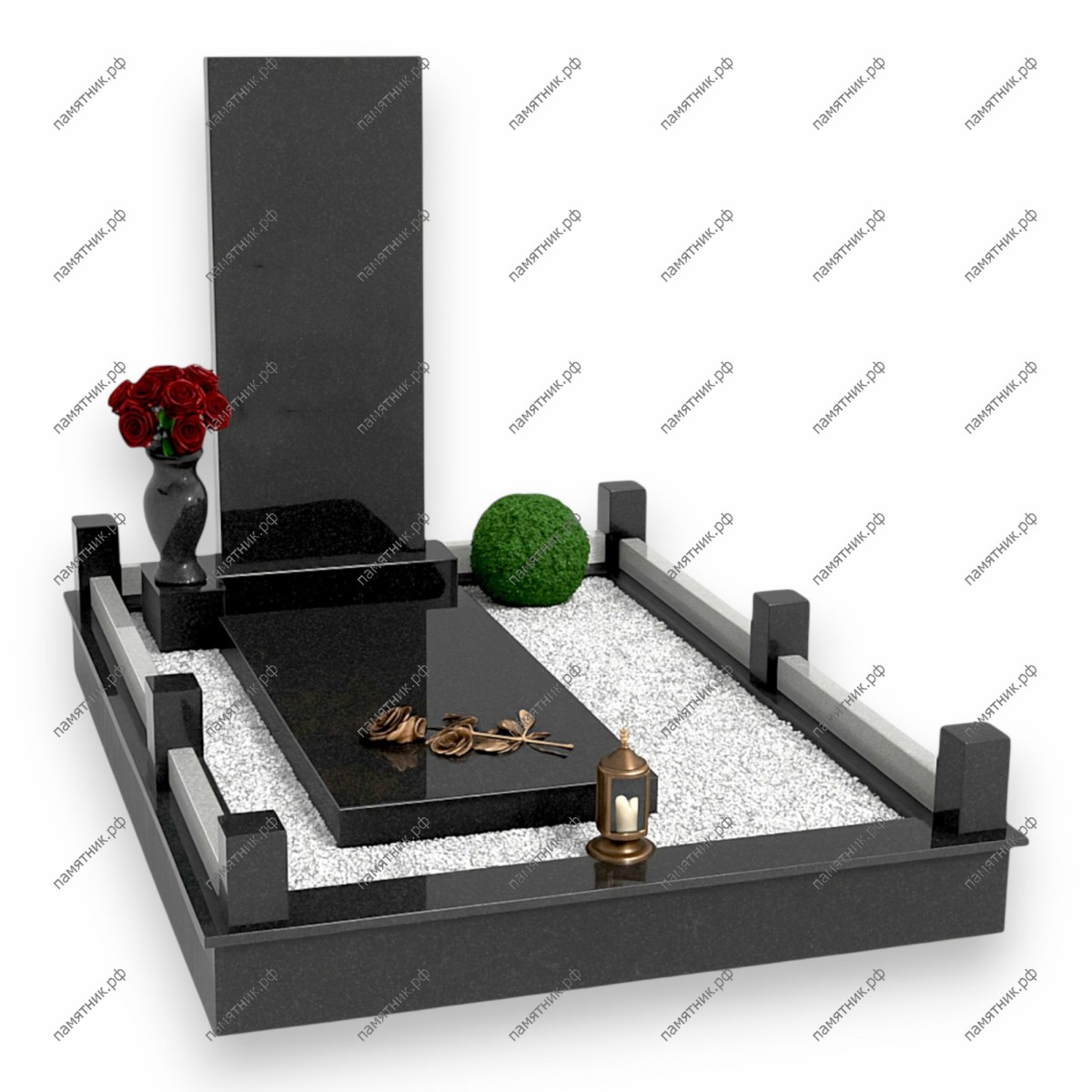 Особенности: Участок засыпан белым декоративным камнем, создающим резкий контраст с черным гранитом. Ограждение выполнено из массивных столбиков, соединенных светлыми перекладинами. На углу установлена бронзовая лампада.