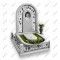 Особенности: Полукруглый цветник обрамлен невысокой кованой оградой, повторяющей мотив винограда. Внутри высажена сочная трава и живые цветы. Справа на отдельной подставке стоит темная ваза с белыми розами.