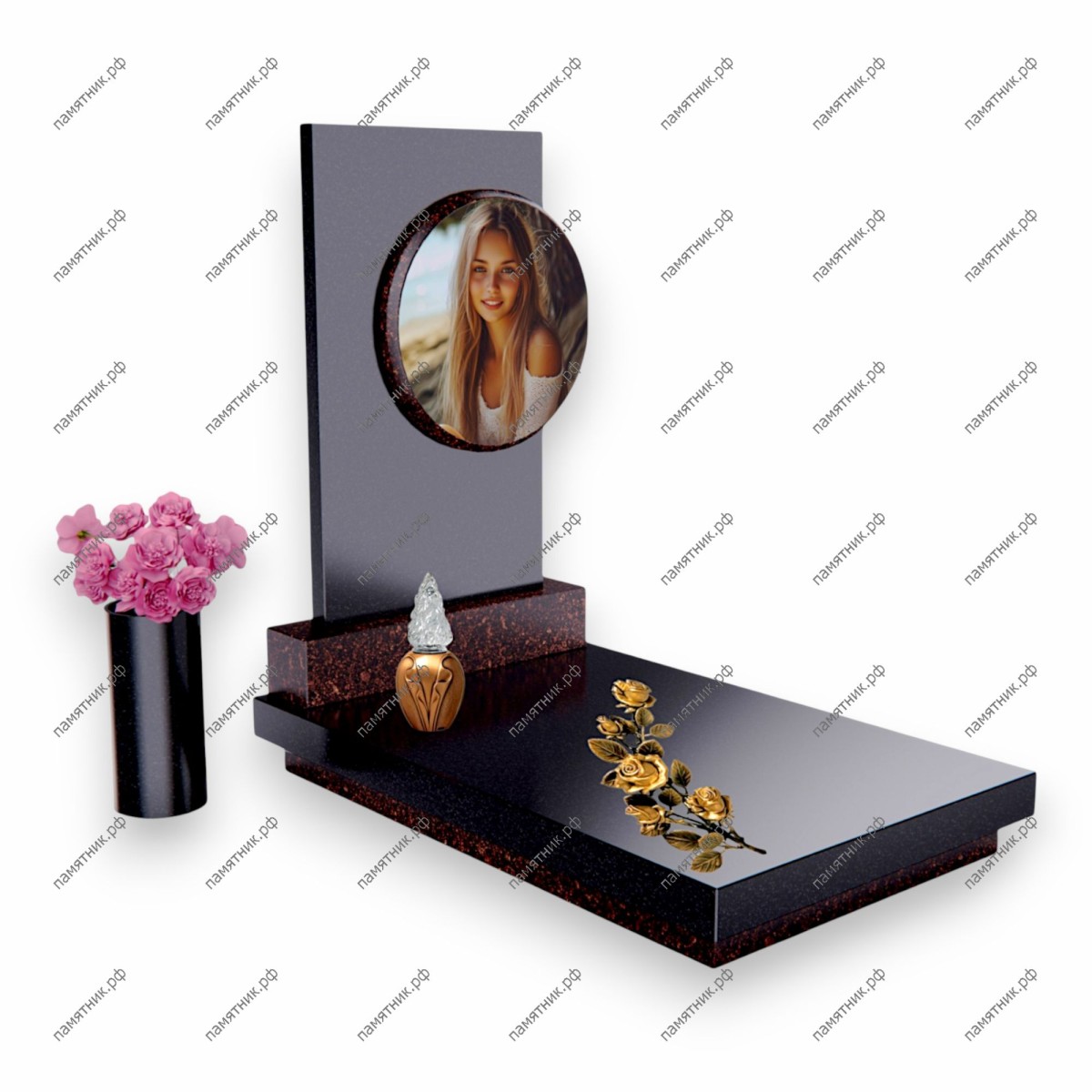 Описание: Современная, минималистичная и очень стильная модель. Центральная черная прямоугольная стела украшена большим круглым портретом. Внутренняя окантовка портрета выполнена в красно-коричневых тонах, перекликаясь с цветом основания.
