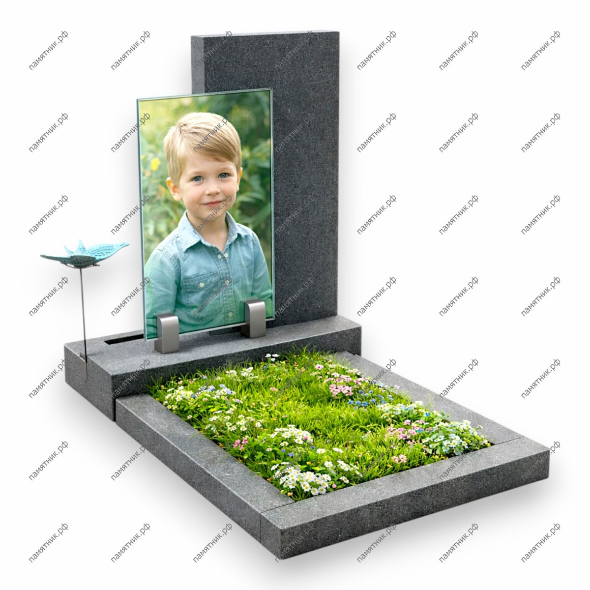 Особенности: Закрытый гранитный цветник с разнотравьем. Слева установлена тонкая кованая фигурка птицы, символизирующая улетевшую душу.