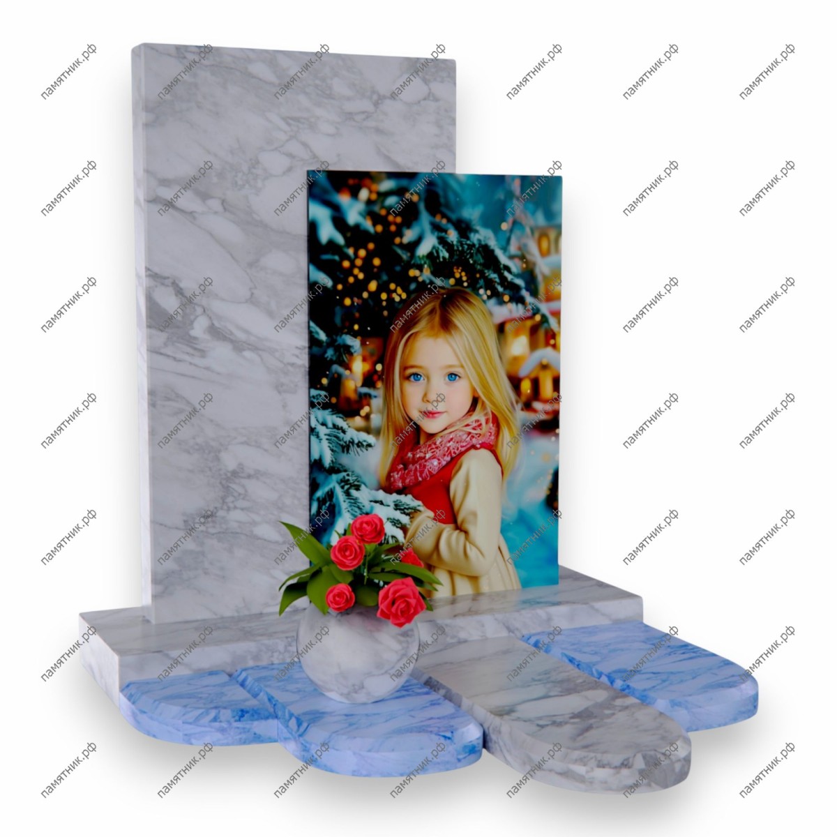 Особенности: Внимание привлекает совершенно нестандартное, авторское основание: надгробная плита вырезана в виде расходящихся лепестков цветка или облаков. Часть этих "лепестков" выполнена из красивого камня небесно-голубого оттенка. Композицию органично завершает круглая светлая ваза с розами.