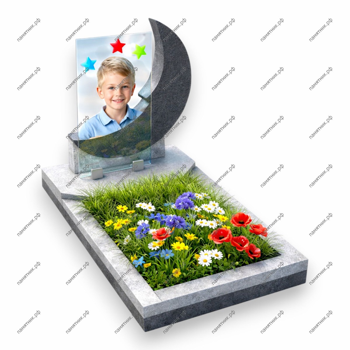 Описание: Тематическая композиция «Месяц и звезды». Правая часть стелы вырезана в форме полумесяца из темного камня, который обнимает стеклянную панель с портретом. Портрет украшен яркими разноцветными звездами.