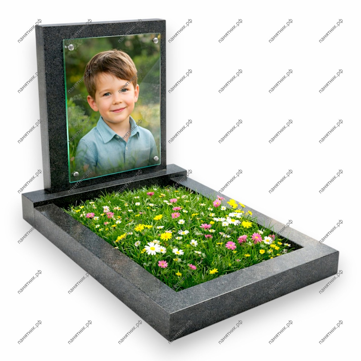 Описание: Лаконичный и строгий памятник современного дизайна. Портрет ребенка защищен прямоугольным стеклом, закрепленным на стеле с помощью декоративных металлических болтов, что придает мемориалу современный вид.