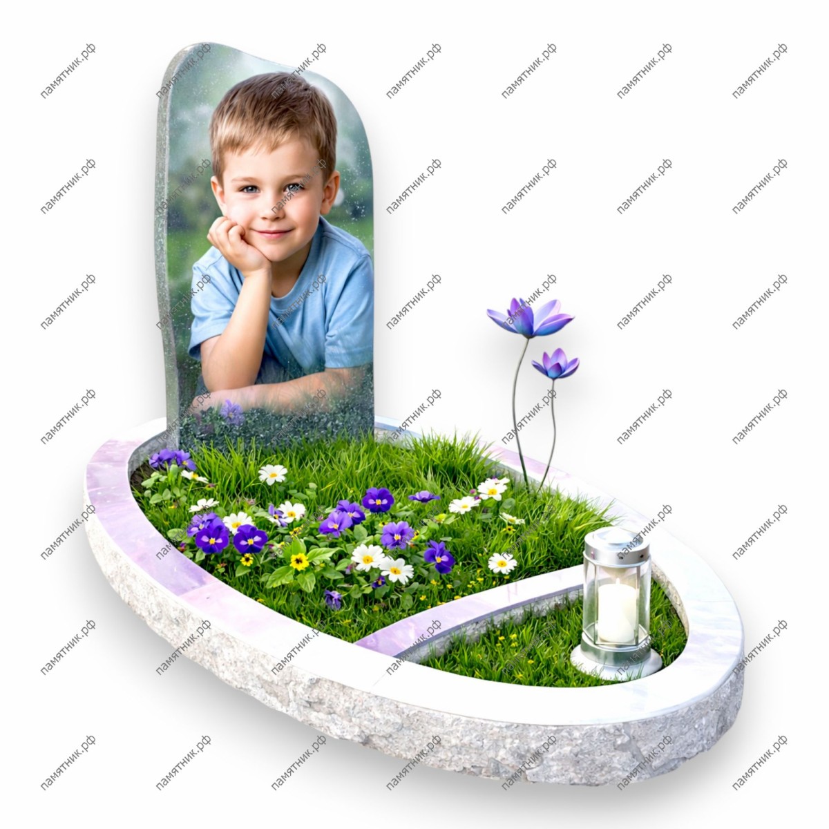 Описание: Уникальный памятник овальной формы. Вертикальная стела с портретом плавно переходит в овальное основание-кольцо. Дизайн дополнен изящными искусственными цветами фиолетового оттенка, тянущимися вверх.