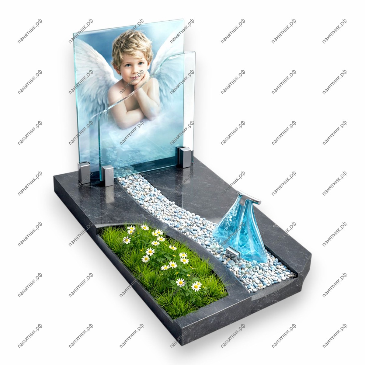 Описание: Высокотехнологичный мемориал в стиле модерн. Стела состоит из нескольких стеклянных панелей, создающих эффект глубины: на заднем плане — нежный образ ребенка-ангела с крыльями.