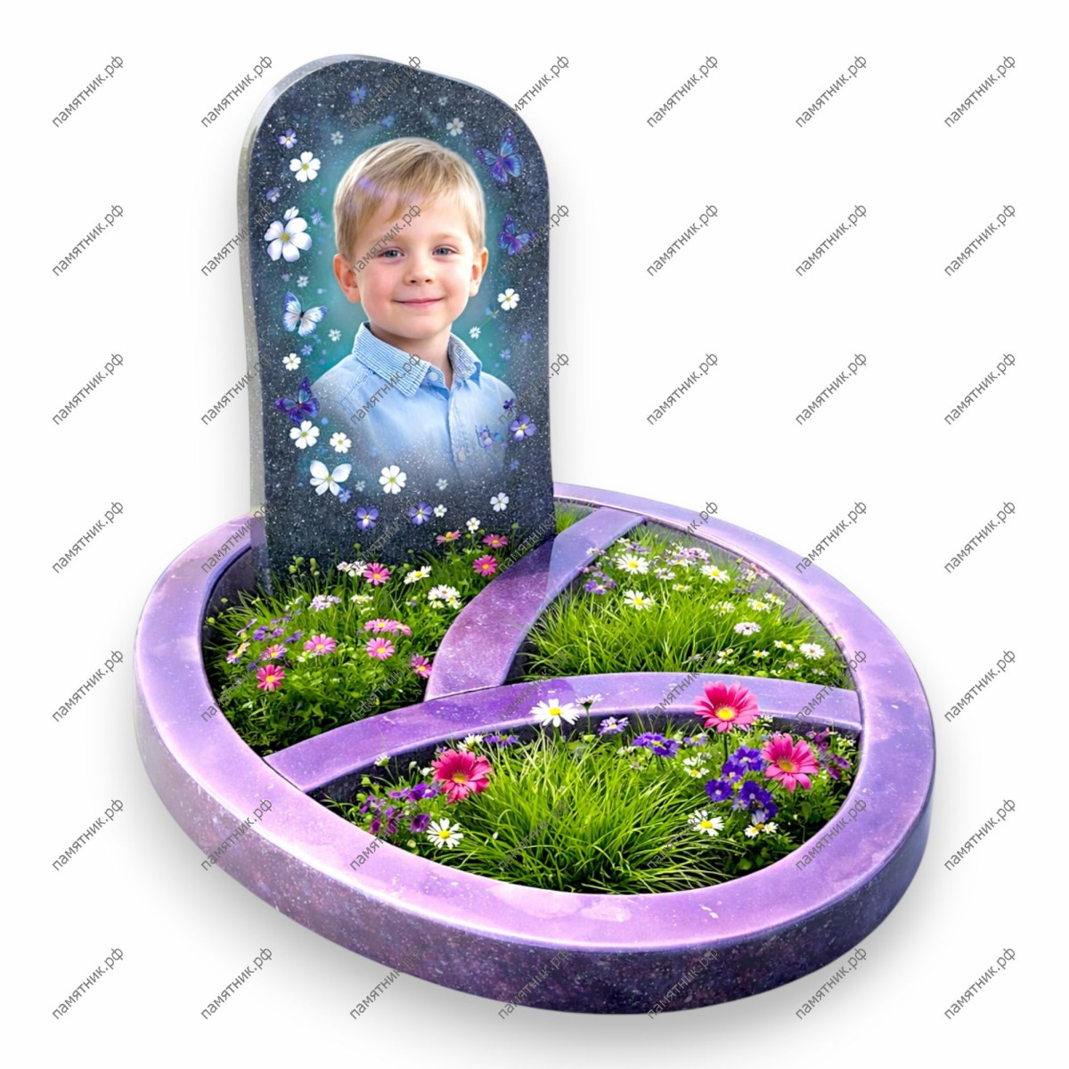 Материал: Фиолетовый декоративный камень (полимер или окрашенный гранит), темная стела.