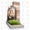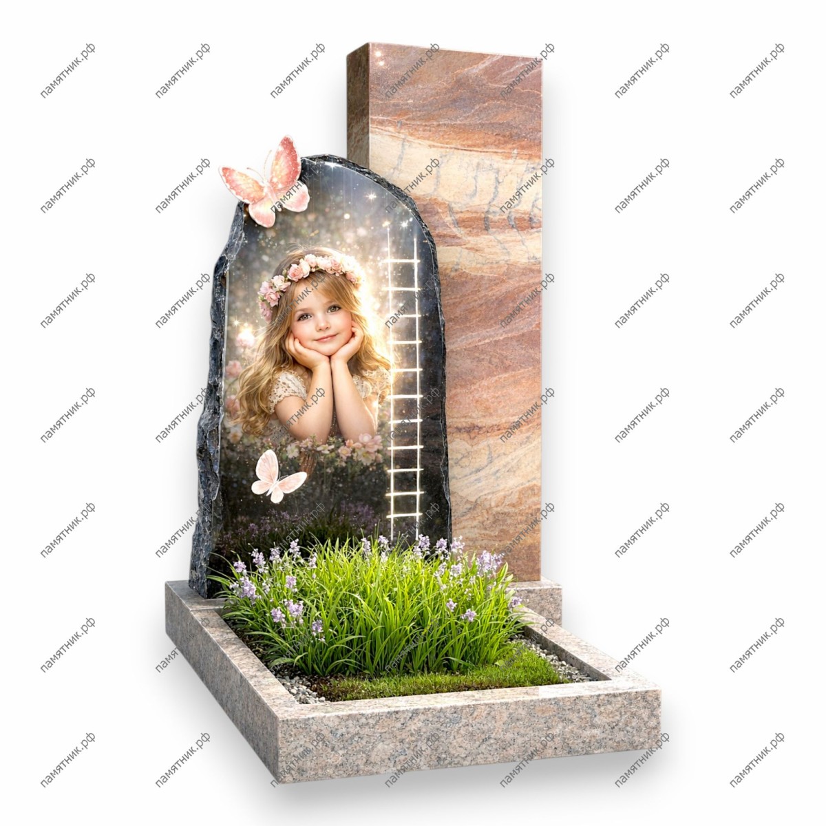 Описание: Оригинальная двухслойная композиция. Задняя высокая стела из полированного камня служит фоном для передней плиты с «рваными» краями, на которой размещен нежный портрет девочки в венке.