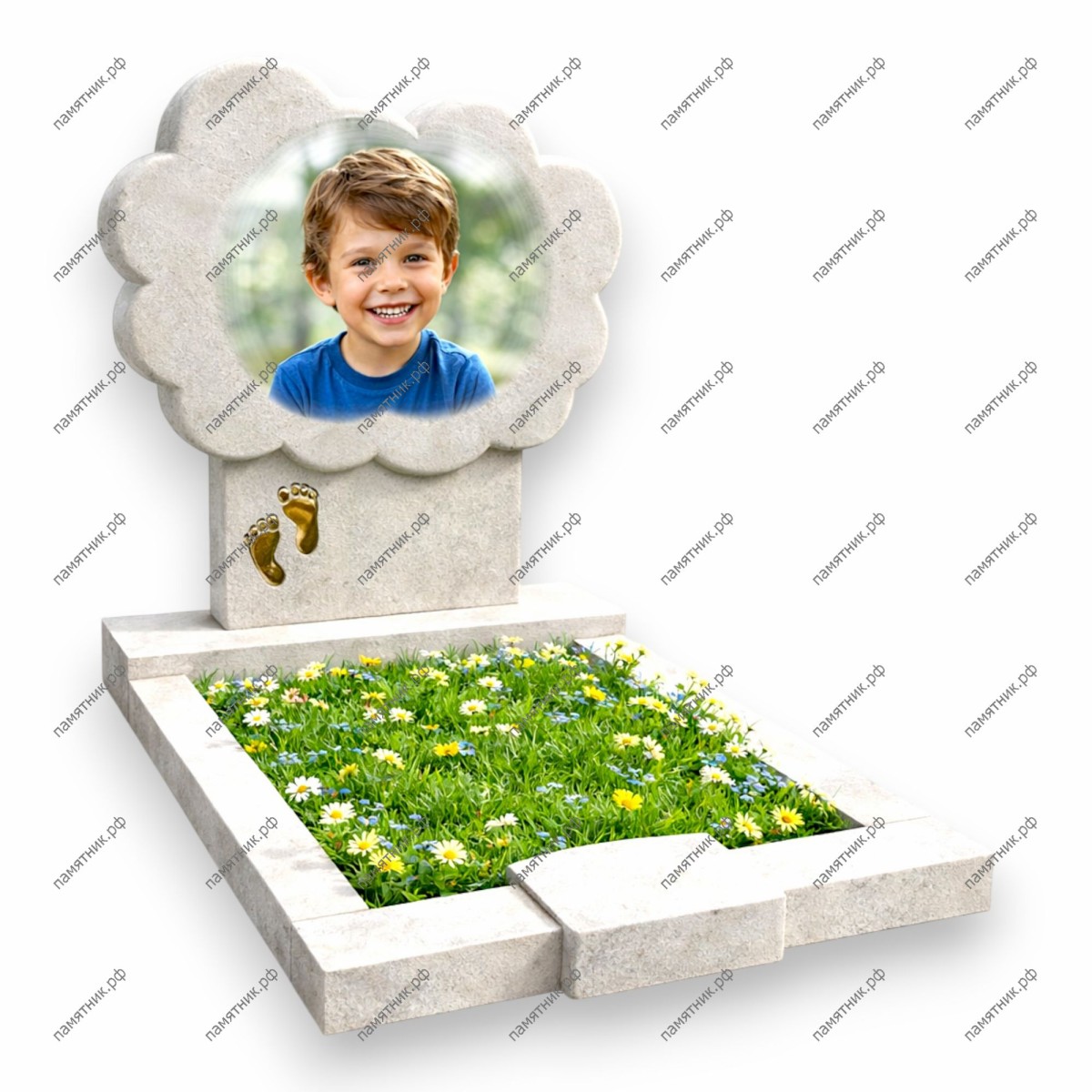 Описание: Трогательный памятник, центральная часть которого выполнена в форме пушистого облака с портретом ребенка. На постаменте под облаком размещены объемные золотистые оттиски детских ножек.