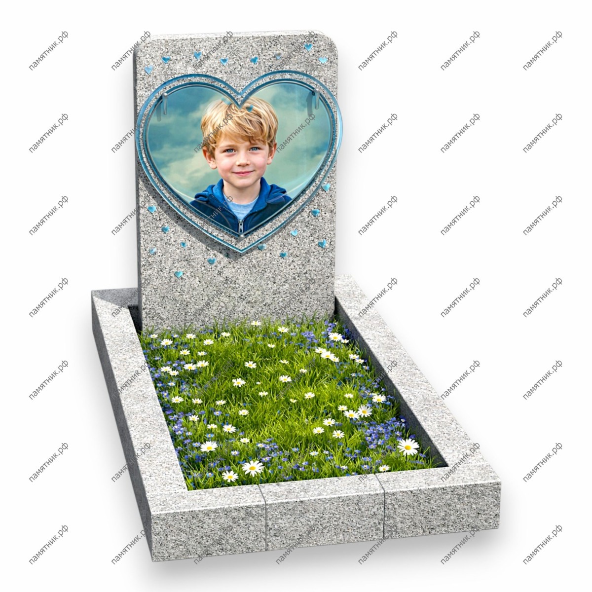 Особенности: Поверхность стелы украшена россыпью маленьких голубых сердечек. Цветник выполнен в едином стиле с основанием из серого гранита.