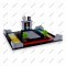 Особенности: Главный цветовой акцент сделан на надгробной плите: по обе стороны от центральной серой панели расположены яркие стеклянные (или керамические) вставки с пейзажами (золотая осень слева и абстрактный яркий фон справа). Композиция дополнена бронзовыми лампадами и декоративными вазонами с зеленью.