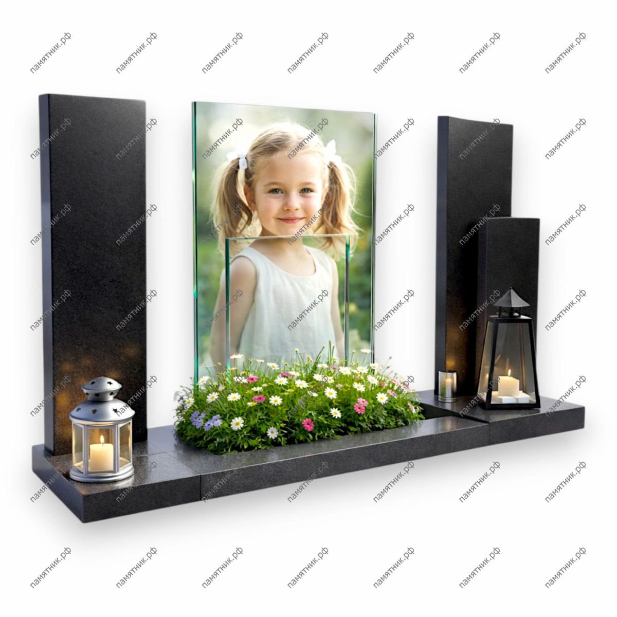Описание: Архитектурная композиция в стиле минимализма. Центральное стеклянное полотно с портретом девочки обрамлено тремя гранитными колоннами разной высоты.