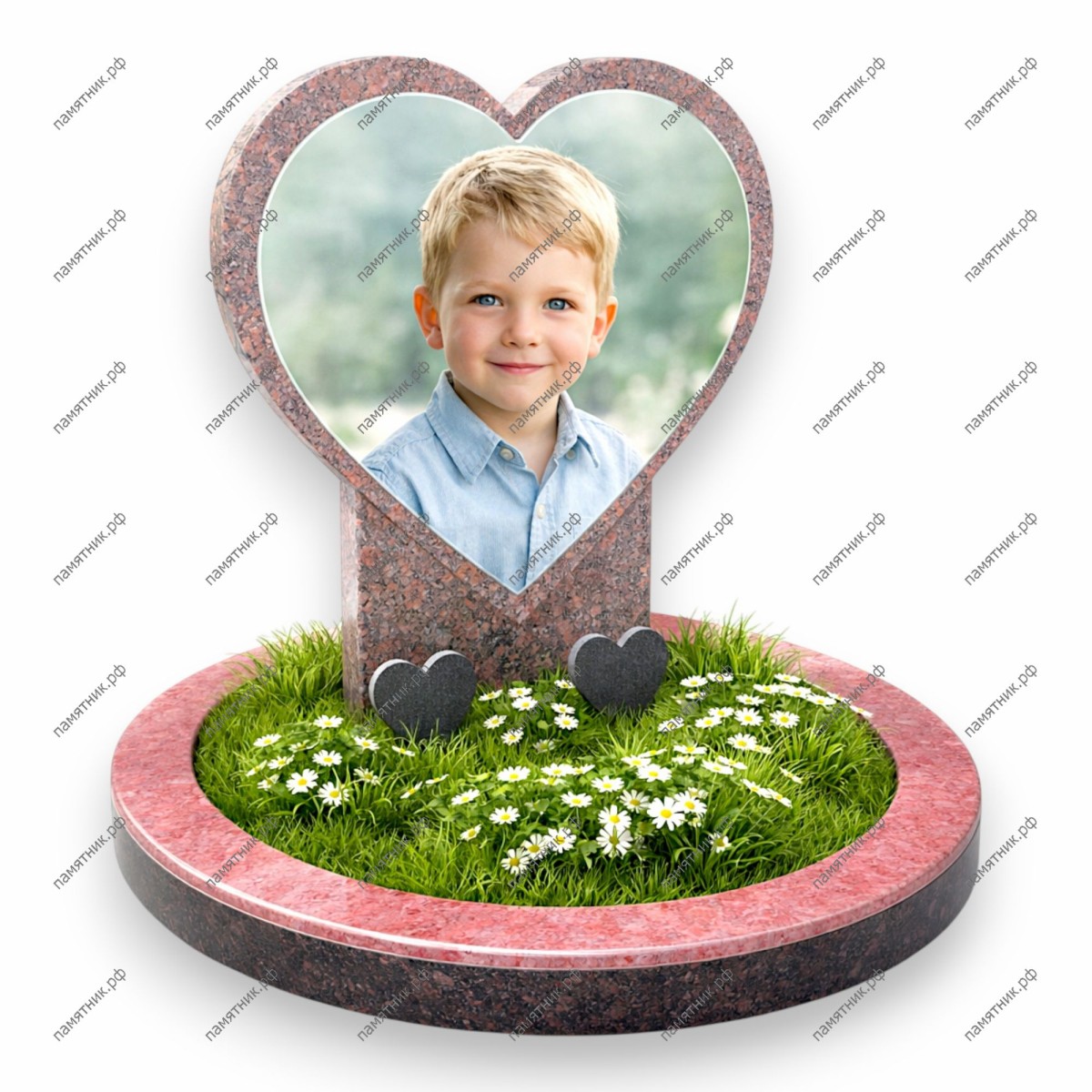 Описание: Классическая форма сердца в ярком исполнении. На стеле размещен крупный портрет, а у ее подножия установлены два маленьких декоративных сердца из темного камня.