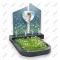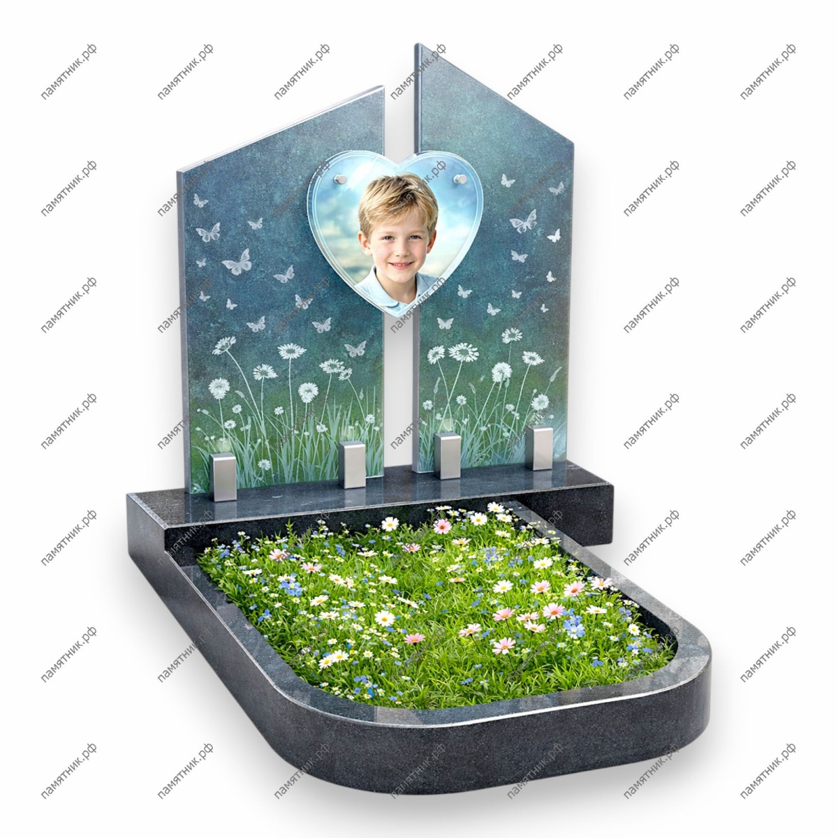 Описание: Современная композиция из двух вертикальных панелей изумрудного цвета с гравировкой одуванчиков и бабочек. В центре на стеклянном сердце закреплен портрет ребенка.