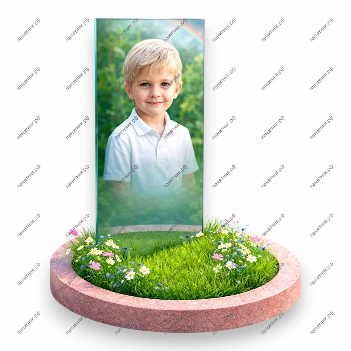 Описание: Лаконичная стеклянная стела с мягким, «растушеванным» портретом мальчика. Сверху на стекле виден легкий эффект радуги.