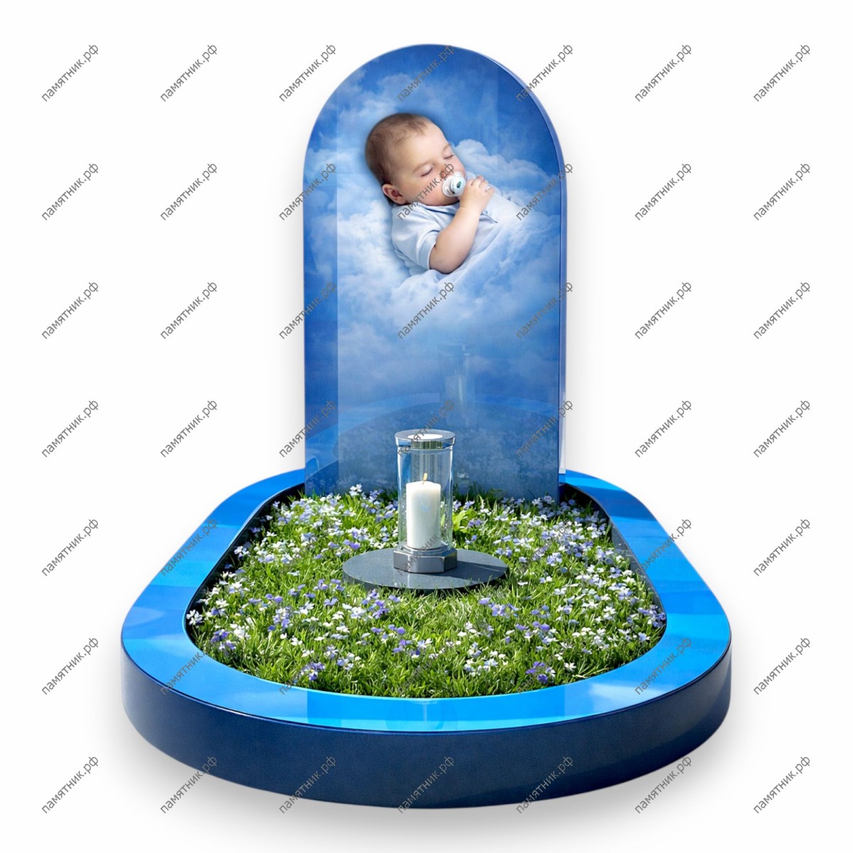 Насыщенный синий цвет мемориала символизирует бесконечность неба. На арочной стеле — изображение спящего младенца в облаках.