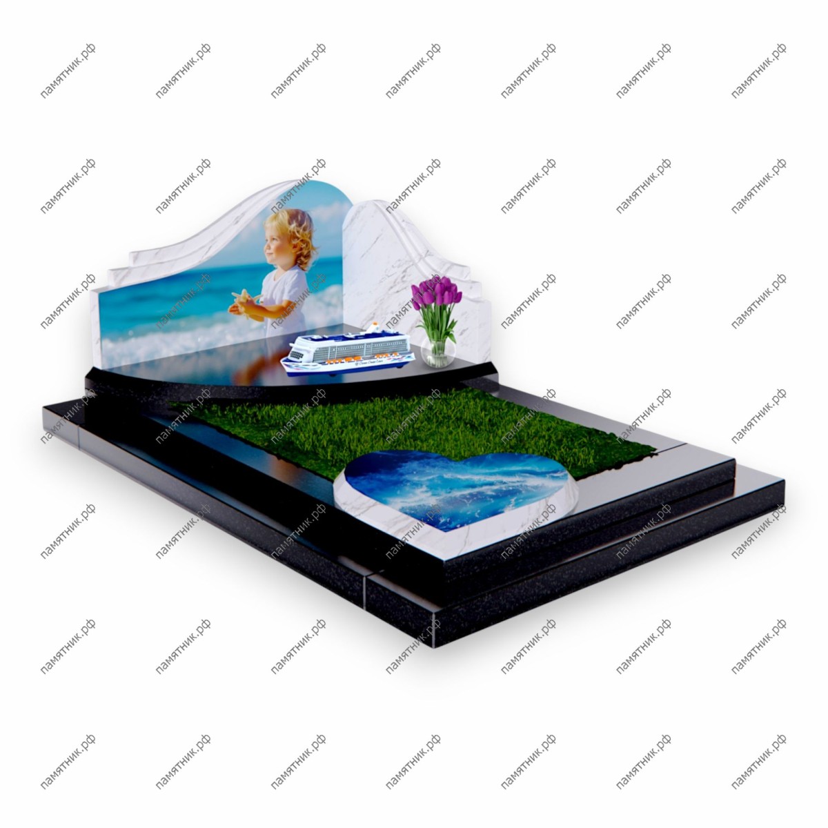 Особенности: На черной надгробной плите установлена игрушечная модель круизного лайнера и прозрачная ваза с сиреневыми тюльпанами. Часть цветника засеяна зеленым газоном, а в изножье интегрирован элемент в форме сердца с реалистичным изображением набегающей морской волны.