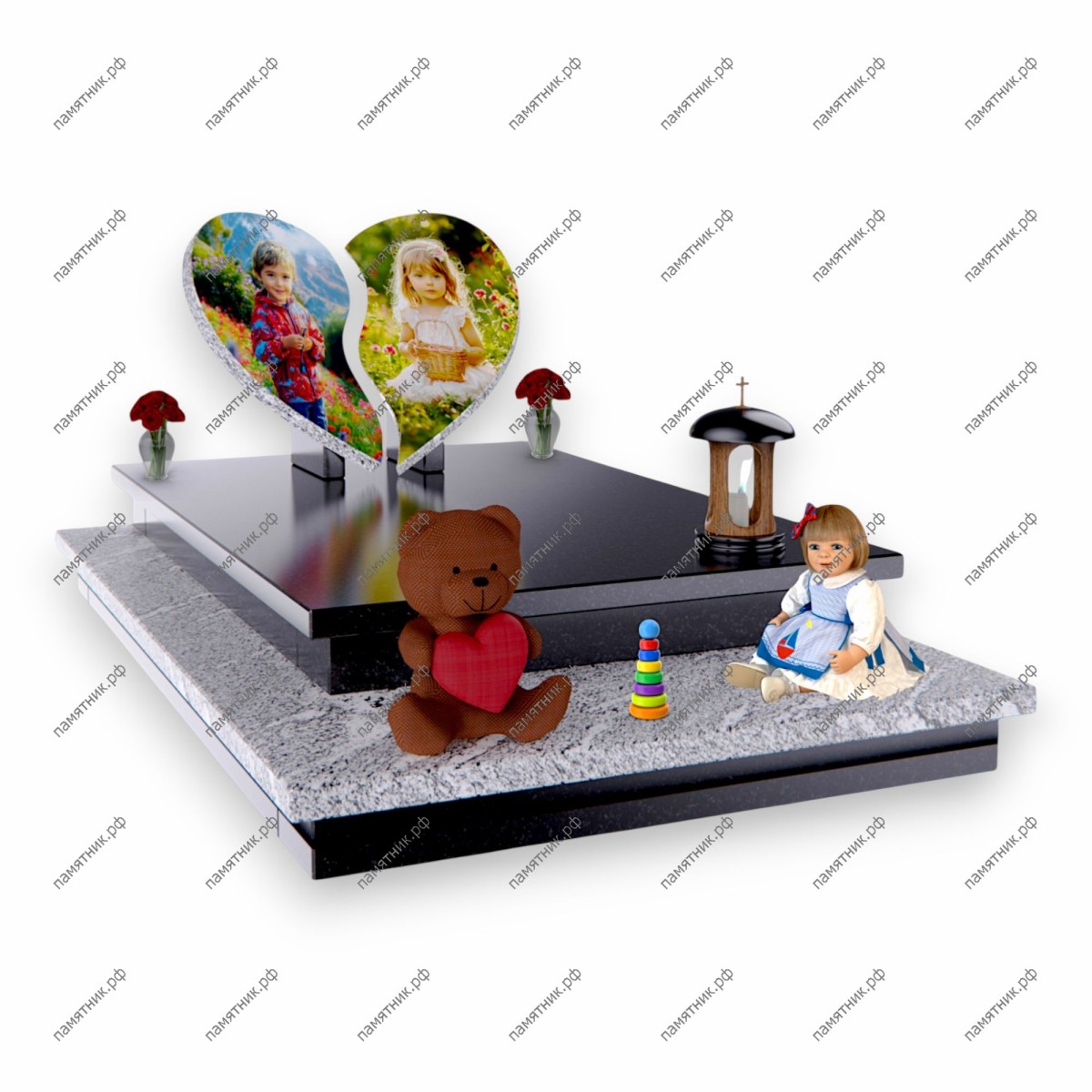 Особенности: Основание состоит из полированной черной плиты и широкого светло-серого подиума. На подиуме расставлены любимые игрушки: плюшевый медведь с красным сердцем, пирамидка и кукла. Рядом с портретами предусмотрены вазы с красными розами, а на черной плите установлена лампада.