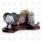 Особенности: Основание имеет изящную фигурную форму с плавными изгибами и черной вставкой. Слева на подиуме сидит кукла, по центру установлена бронзовая лампада, а справа — светло-серая скульптура коленопреклоненного молящегося ангела и небольшая прозрачная ваза с яркими цветами. На заднем фоне высажен куст с розовыми цветами.