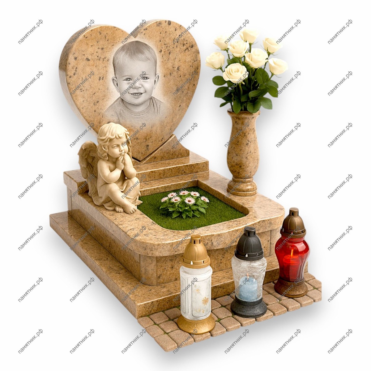 Описание: Светлый и нежный памятник. Основная стела выполнена в форме классического ровного сердца, на котором расположен крупный черно-белый портрет улыбающегося малыша.