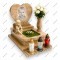 Особенности: Цветник оформлен в виде прямоугольной гранитной рамы, внутри которой высажен газон с белыми маргаритками. Слева у основания сердца сидит бежевая скульптура маленького ангела. Справа установлена гранитная ваза с букетом белых роз. Перед цветником на вымощенной плитке площадке располагаются три лампады разного дизайна (золотистая, прозрачная и красная).