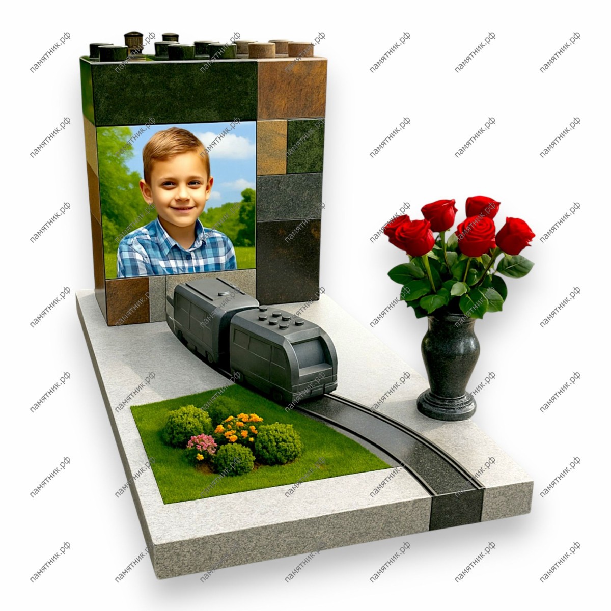 Описание: Уникальный памятник, стилизованный под конструктор LEGO. Стела собрана из прямоугольных и квадратных гранитных блоков разных цветов с характерными выступами-«шипами» на верхней грани. В центре композиции интегрирован большой цветной квадратный портрет мальчика на фоне природы.