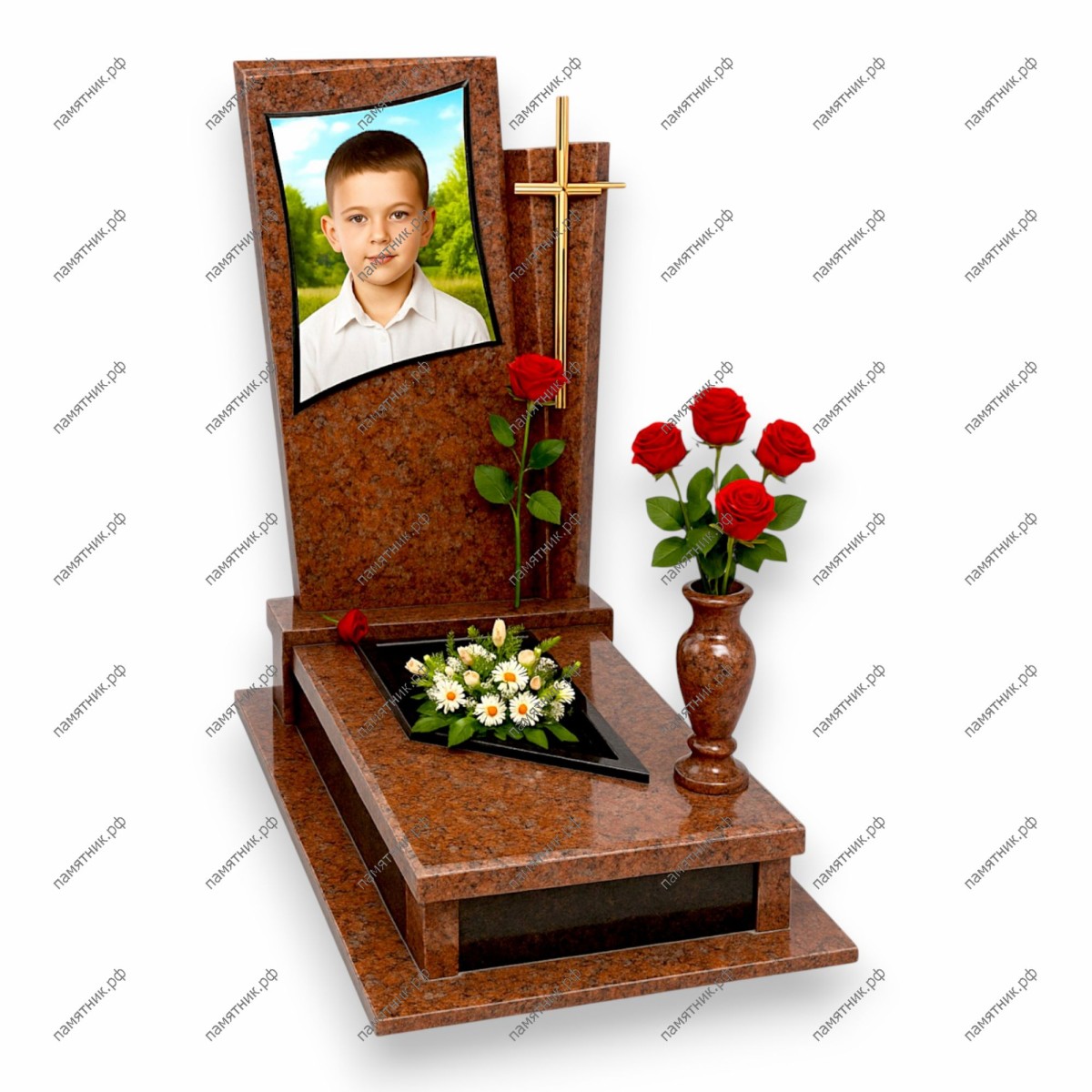 Описание: Классическая прямоугольная стела со слегка скошенным верхом. Левую часть занимает крупный цветной портрет мальчика на фоне пейзажа. Справа на стеле вырезан рельефный крест, декорированный золотом.
