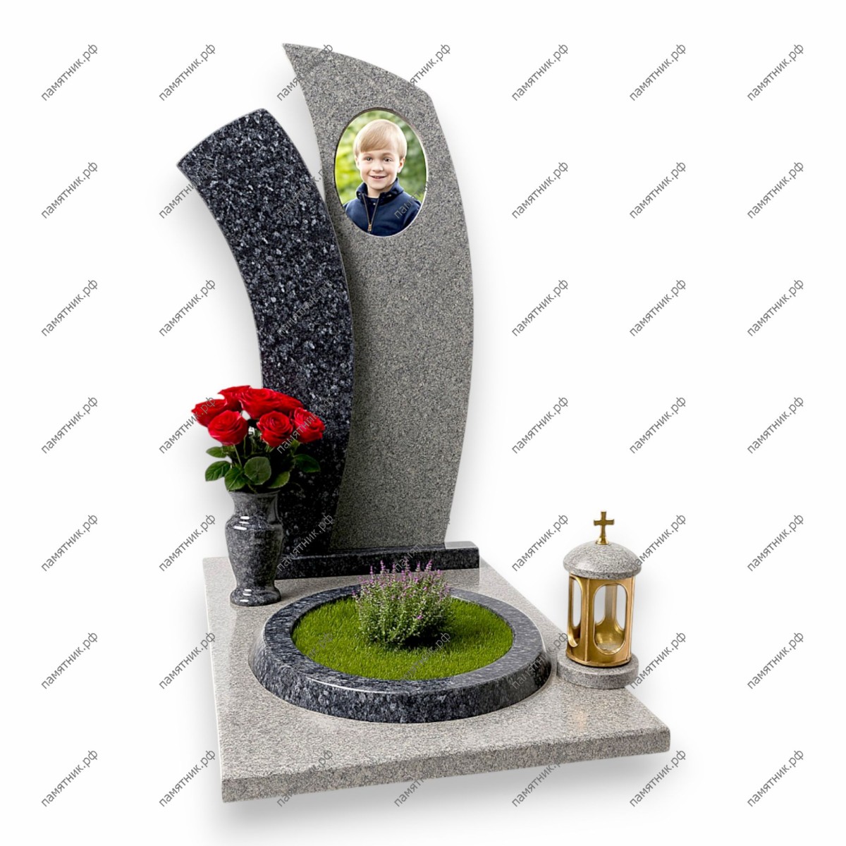 Описание: Изящная абстрактная композиция. Стела состоит из двух изогнутых элементов, стремящихся вверх. Правая, светло-серая часть, шире — на ней в овальной нише расположен цветной портрет мальчика. Левая часть выполнена из контрастного темного гранита.